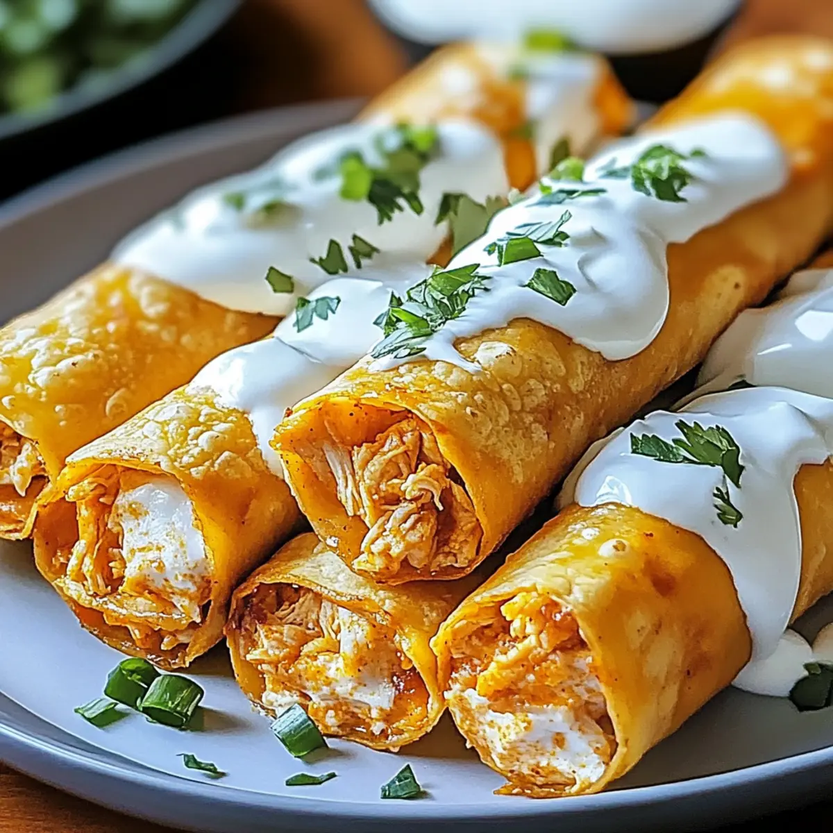 Once the Baked Buffalo Chicken Taquitos are out of the oven, let them cool for a minute. Then, sprinkle the chopped green onions over the taquitos for an added crunch and pop of color. Serve immediately with a side of sour cream for dipping, which will balance the spicy buffalo flavor beautifully and elevate your snacking experience.