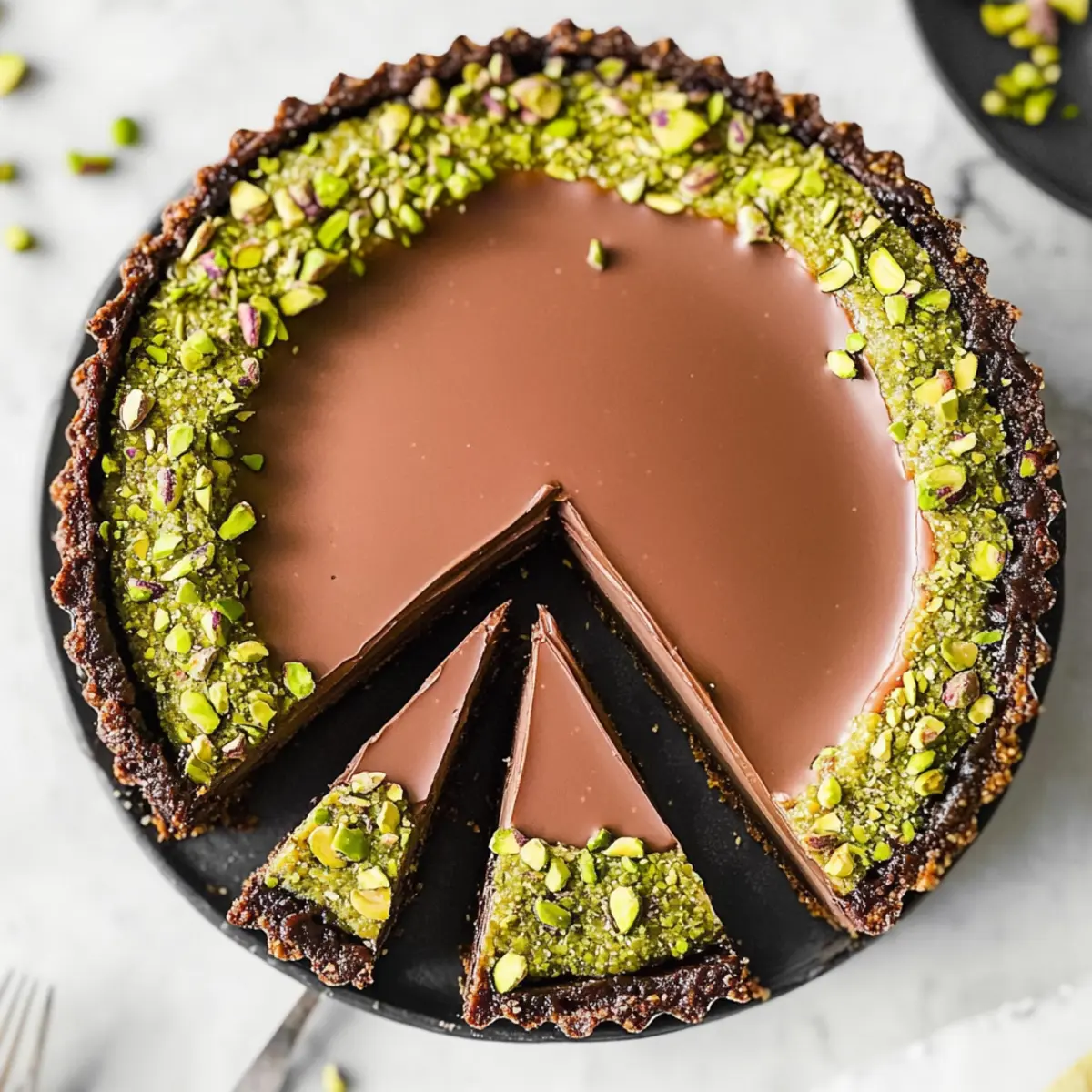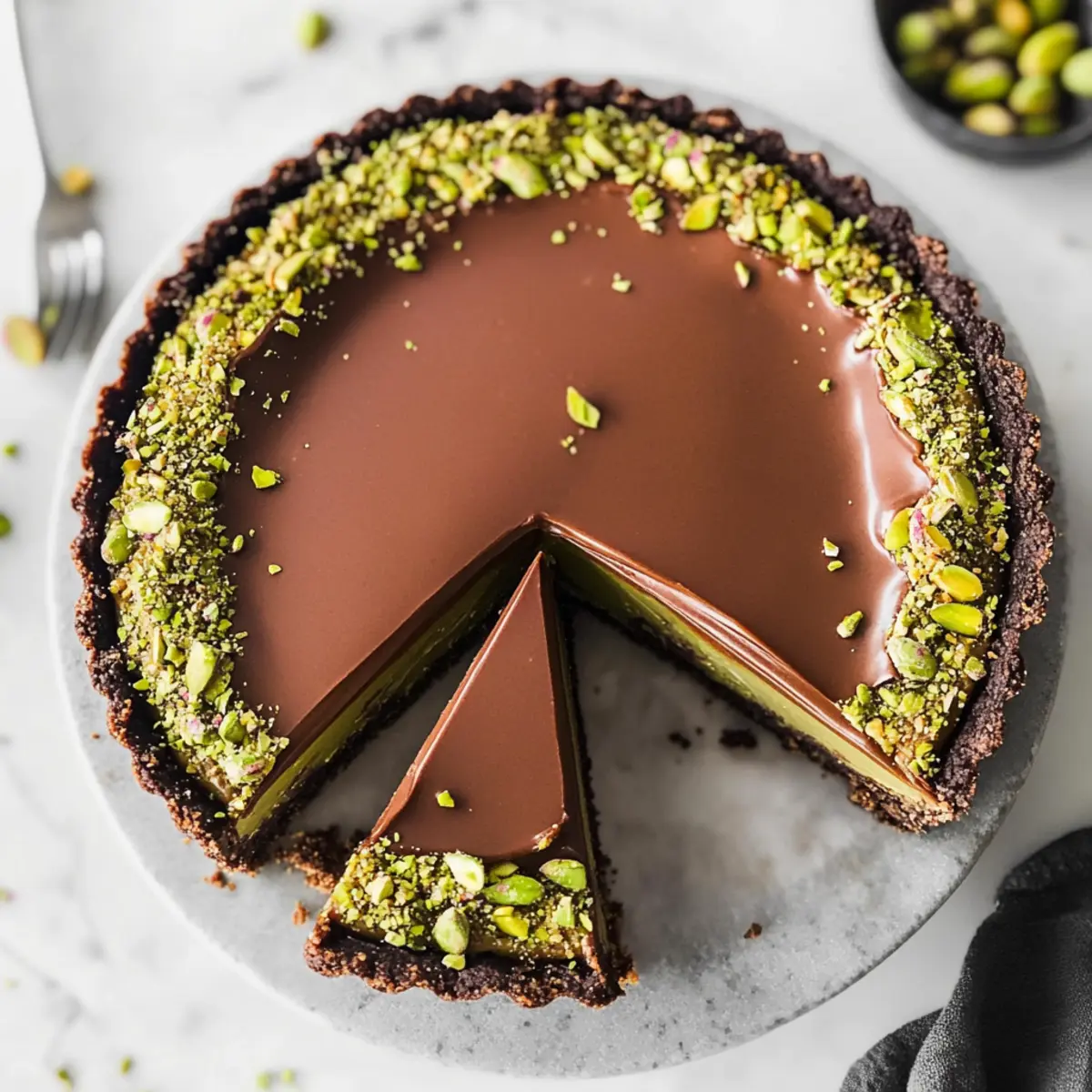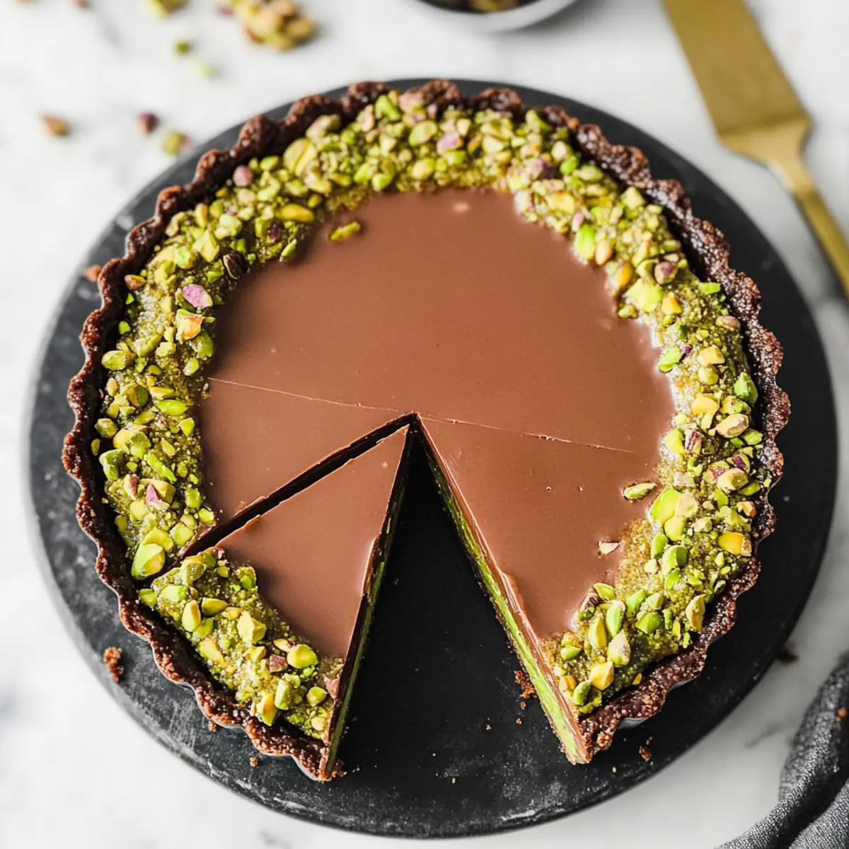 Serving Tip: For best results, allow the tart to sit at room temperature for a few minutes before serving after freezing. This will enhance the slicing experience and bring out the rich flavors of the chocolate and pistachio layers.