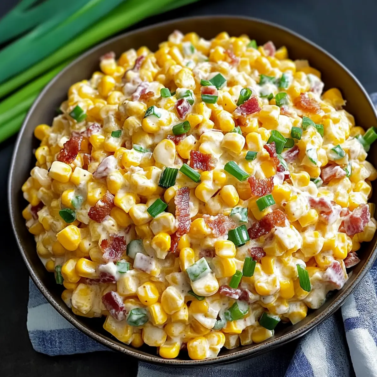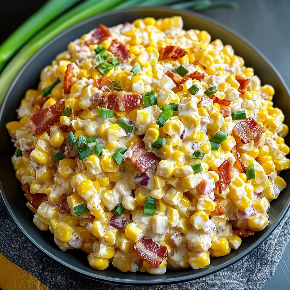 - Fold in corn kernels, cheddar cheese, crumbled bacon, and sliced green onions into the dressing. Mix gently until evenly coated.