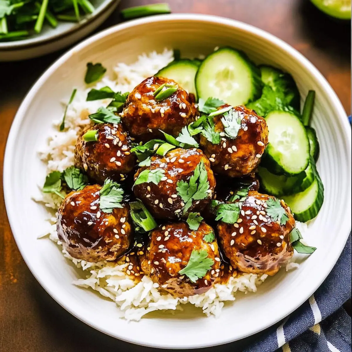 - Serve the meatballs over steamed rice, garnished with sesame seeds and freshly chopped scallions.