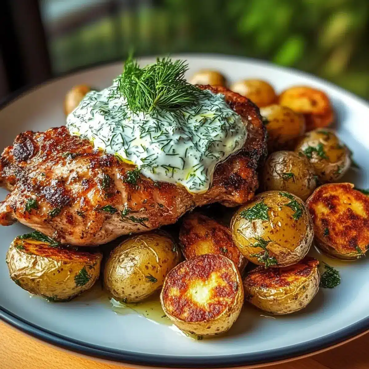 - Plate the chicken with crispy potatoes and drizzle dill feta cream over the top.