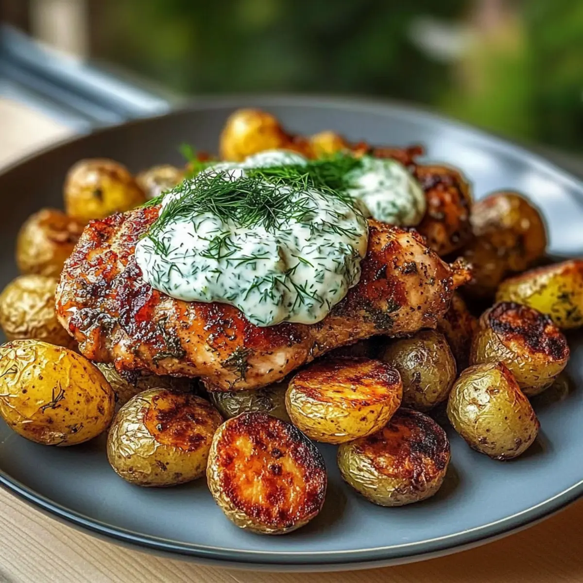 Once everything is cooked, plate your golden, seared chicken alongside the crispy baby potatoes. Drizzle the luscious dill feta cream generously over the chicken, and garnish with a sprinkle of extra fresh dill for an added pop of color and flavor. Your Spicy Yogurt Marinated Chicken with Dill Feta Cream & Crispy Baby Potatoes is now ready to impress!
