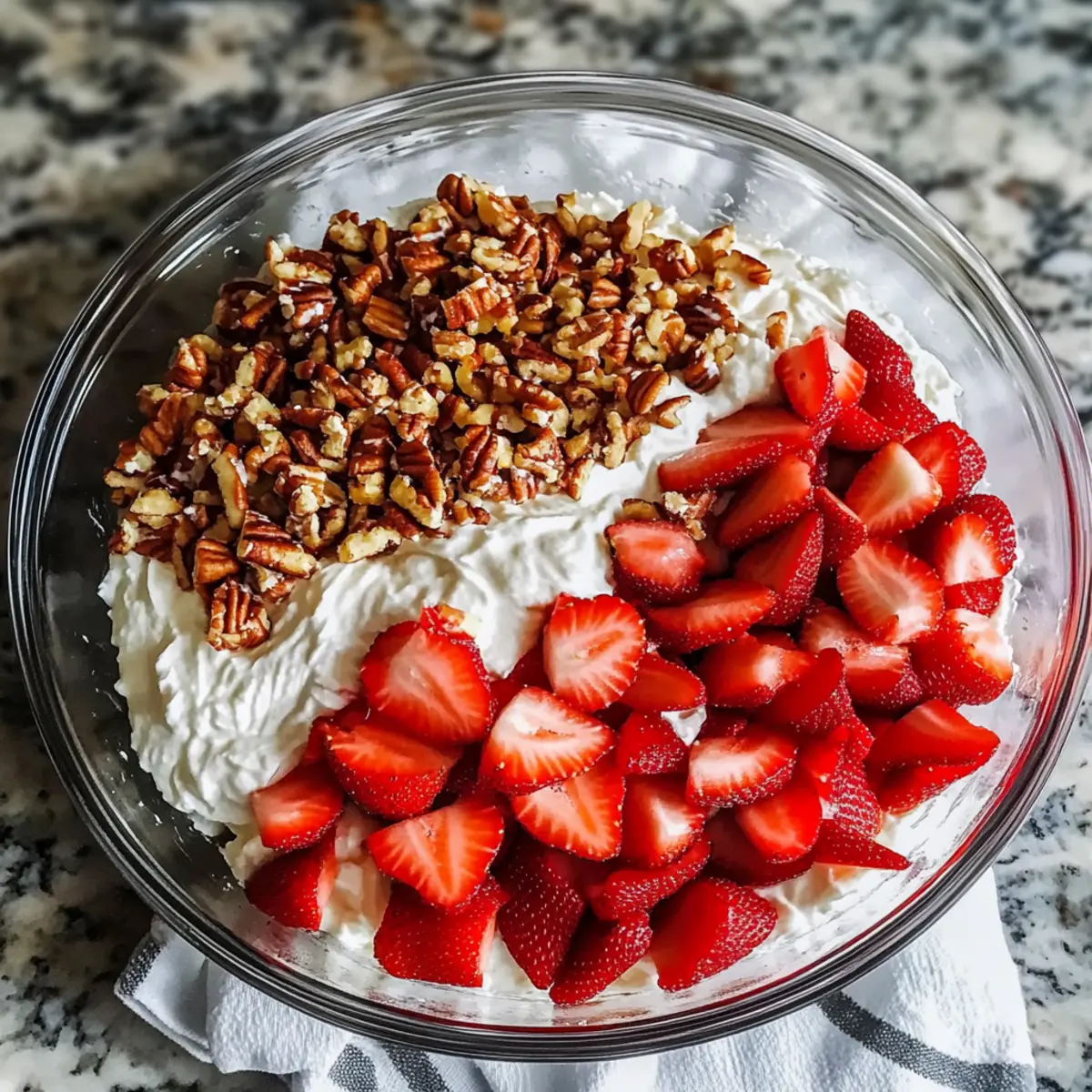 In a medium-sized bowl, combine crushed pretzels, chopped pecans, and brown sugar. Pour in melted butter and stir everything together until well incorporated. This mixture creates the delicious crunch that complements the creamy layers of the Strawberry Crackle Salad. The combination should feel moist but not overly wet.