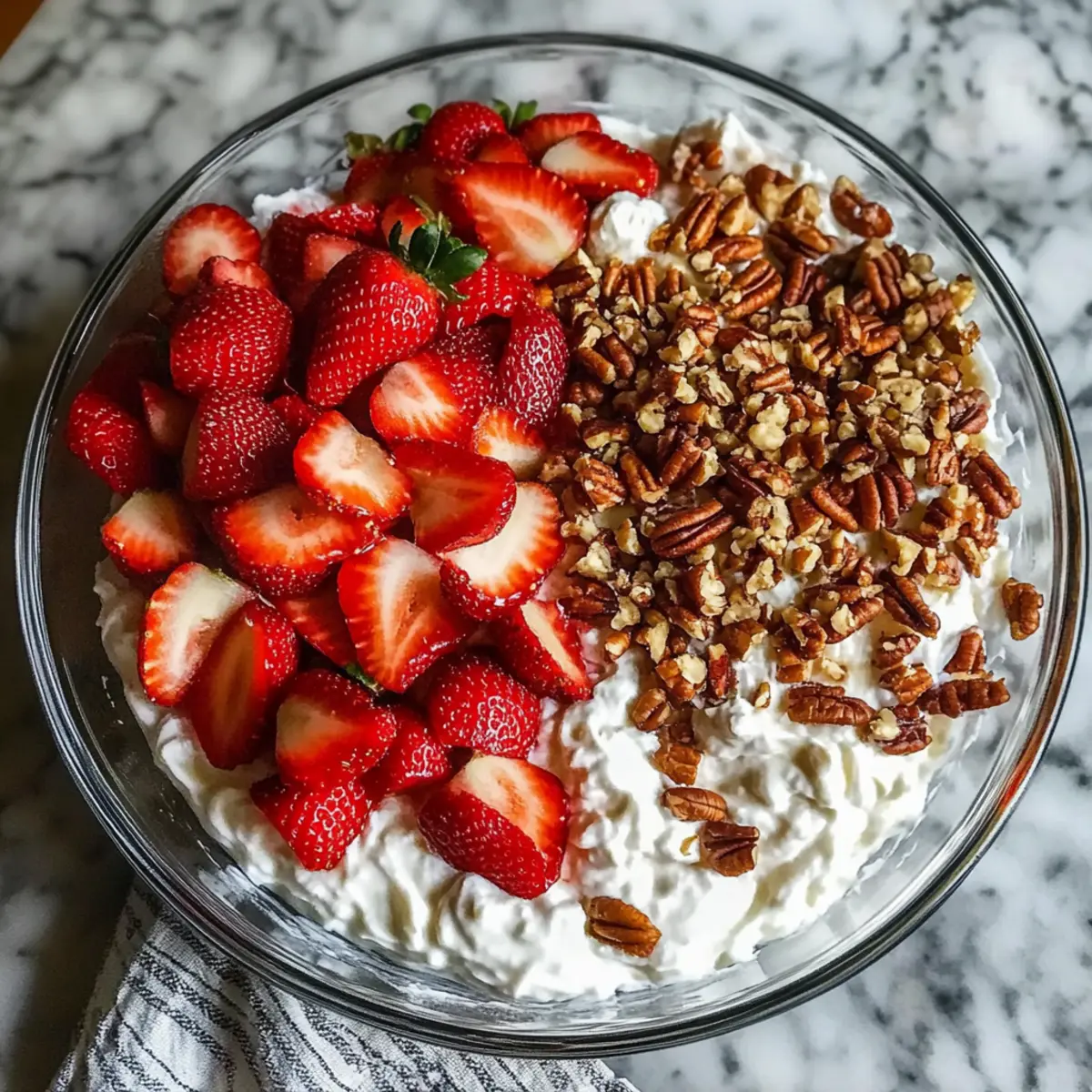 - Layer the salad in a serving dish starting with the creamy mixture, then add sliced strawberries.